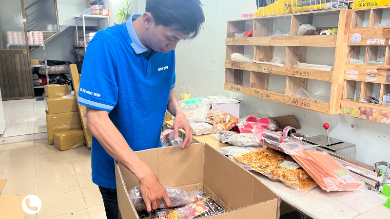 Hỗ trợ đóng thùng carton, gia cố chống va đập. Thực phẩm khô được hút chân không tại kho để gọn sạch và bảo quản tốt hơn.